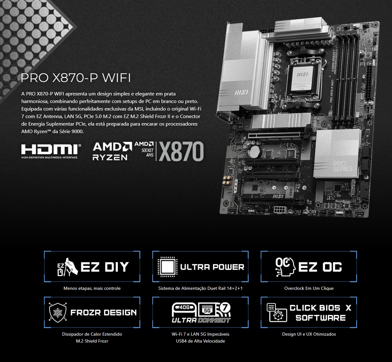 Motherboards MSI da série AMD AM5 para o chipset X870. Concebida para combinar perfeitamente com os processadores AMD Ryzen 9000 e 7000X3D, esta motherboard aproveita o poder da tecnologia orientada por IA para oferecer o melhor desempenho e eficiência. Quer seja um jogador, criador de conteúdos ou um entusiasta avançado, a série MSI AM5 oferece o melhor em termos de recursos de ponta e soluções inteligentes para elevar a sua experiência ao próximo nível.