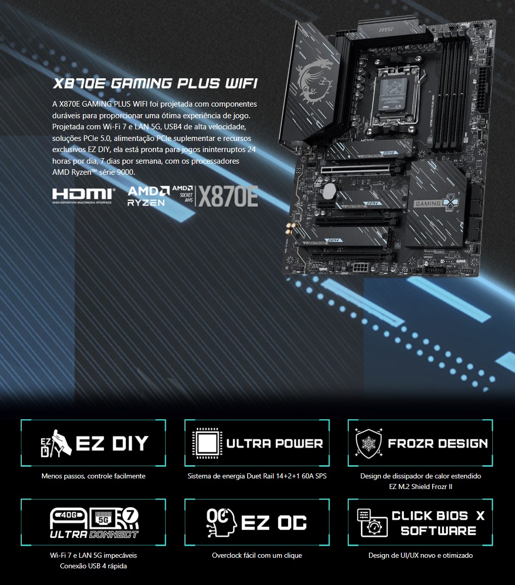 A X870E GAMING PLUS WIFI foi concebida com componentes duradouros para proporcionar uma excelente experiência de jogo. Concebido com Wi-Fi 7 e LAN 5G, USB4 de alta velocidade, soluções PCIe 5.0, alimentação PCIe suplementar e funcionalidades exclusivas EZ DIY, está pronto para jogos ininterruptos 24/7 dos processadores AMD Ryzen™ da série 9000.