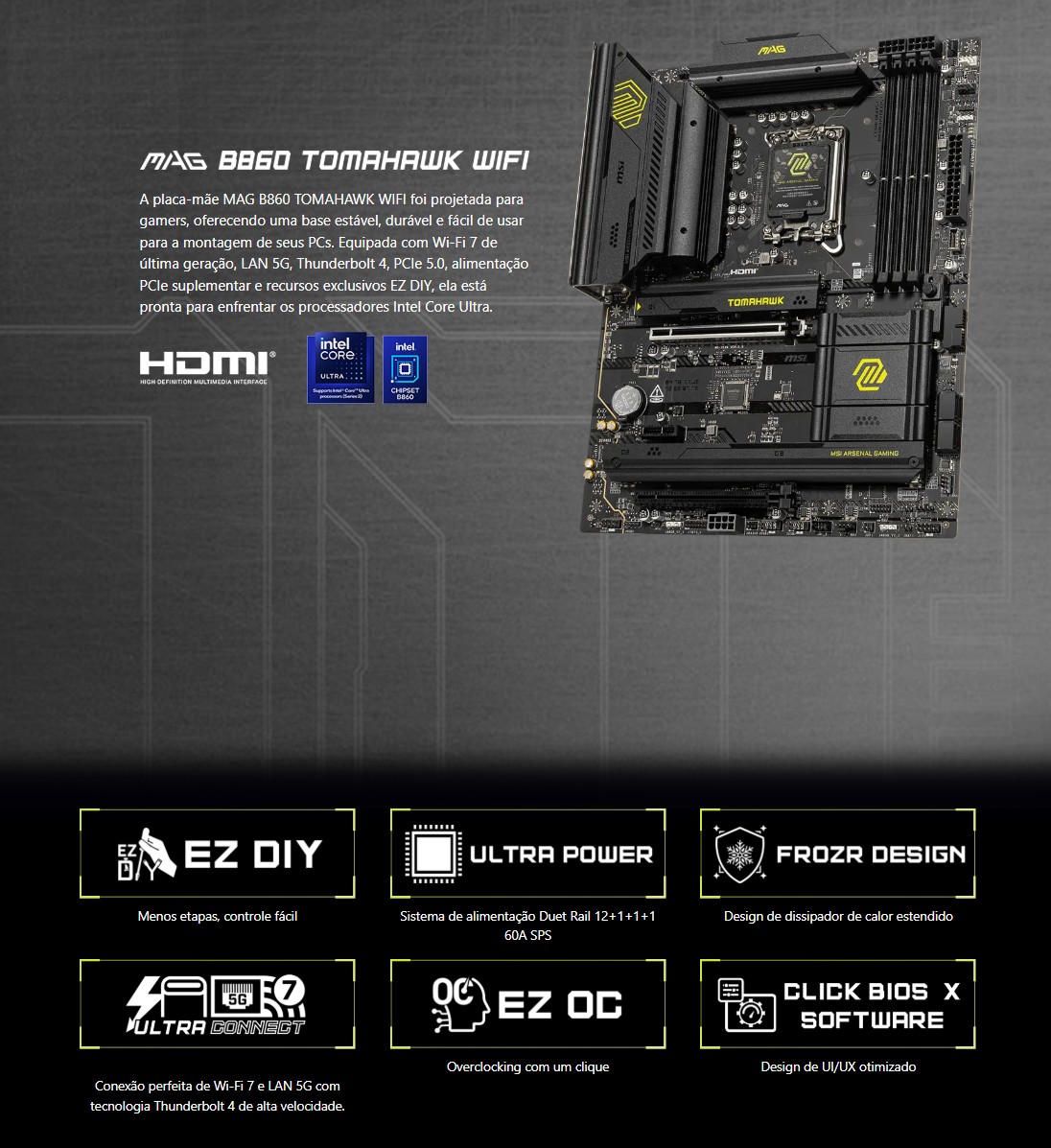 A MAG B860 TOMAHAWK WIFI foi concebida para os jogadores que pretendem uma base estável, duradoura e fácil de utilizar na construção dos seus PCs. Equipado com a solução Killer Wi-Fi 7 e LAN 5G, Thunderbolt 4, soluções PCIe 5.0, alimentação PCIe suplementar e funcionalidades exclusivas EZ DIY, está preparado para a batalha dos processadores Intel Core Ultra.
