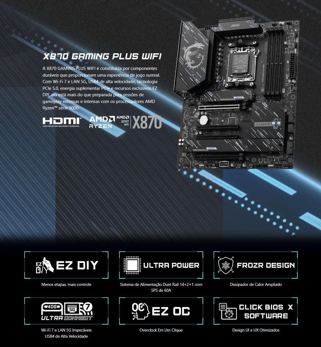 A X870 GAMING PLUS WIFI foi concebida com componentes duradouros para proporcionar uma excelente experiência de jogo. Concebida com Wi-Fi 7 e LAN 5G, USB4 de alta velocidade, soluções PCIe 5.0, alimentação PCIe suplementar e funcionalidades exclusivas EZ DIY, está pronto para jogos ininterruptos 24/7 dos processadores AMD Ryzen™ da série 9000.